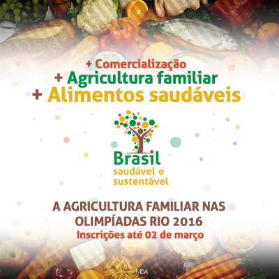 Contagem regressiva para o maior evento esportivo do mundo: os Jogos Olímpicos – Rio 2016. No momento em que o mundo se volta para o País, a agricultura familiar terá oportunidade de divulgar sua produção nas praças ‘Brasil Saudável e Sustentável’, localizadas em quatro pontos turísticos do Rio de Janeiro. A iniciativa é realizada pelos ministérios do Desenvolvimento Agrário (MDA) e do Desenvolvimento Social e Combate à Fome (MDS).