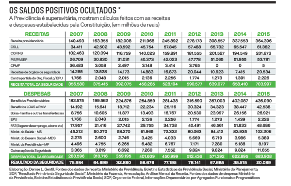 “O resultado do encontro do total de receitas e despesas é amplamente superavitário, incluídos os gastos administrativos com pessoal, custeio e pagamento da dívida de cada setor. O superávit foi 56,7 bilhões de reais em 2010, 78,1 bilhões em 2012, 56,4 bilhões em 2014, e 20,1 bilhões em 2015, apesar das enormes desonerações tributárias realizadas nos últimos cinco anos.”