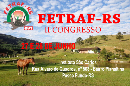 A Federação dos Trabalhadores na Agricultura Familiar do Rio Grande do Sul (FETRAF-RS), estará promovendo nesta terça-feira, dia 27 de junho e quarta-feira, dia 28 de junho, o II Congresso Geral para o planejamento de ações da entidade. O encontro será realizado no Instituto São Carlos, no município de Passo Fundo e deverá reunir participantes dos sindicatos associados de todo o estado.