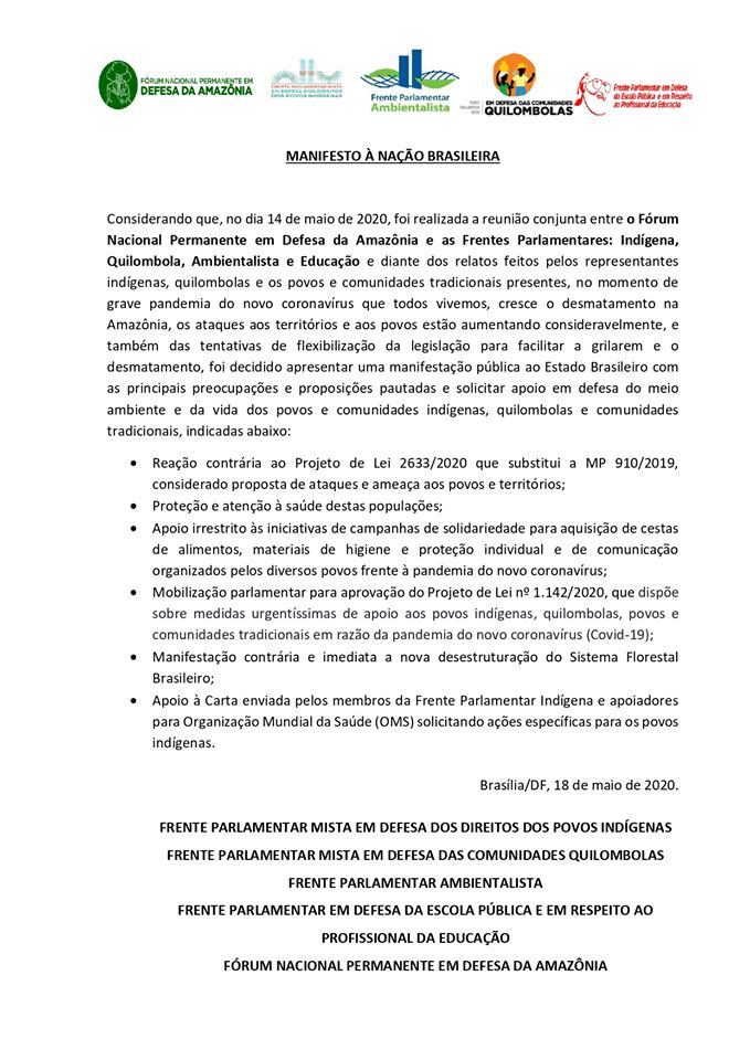 No dia 14 de maio de 2020, foi realizada a reunião conjunta entre o Fórum Nacional Permanente em Defesa da Amazônia e as Frentes Parlamentares: Indígena, Quilombola, Ambientalista e Educação e diante dos relatos feitos pelos representantes indígenas, quilombolas e os povos e comunidades tradicionais presentes, no momento de grave pandemia do novo coronavírus que todos vivemos, cresce o desmatamento na Amazônia, os ataques aos territórios e aos povos estão aumentando consideravelmente, e também das tentativas de flexibilização da legislação para facilitar a grilarem e o desmatamento, foi decidido apresentar uma manifestação pública ao Estado Brasileiro com as principais preocupações e proposições pautadas e solicitar apoio em defesa do meio ambiente e da vida dos povos e comunidades indígenas, quilombolas e comunidades tradicionais.