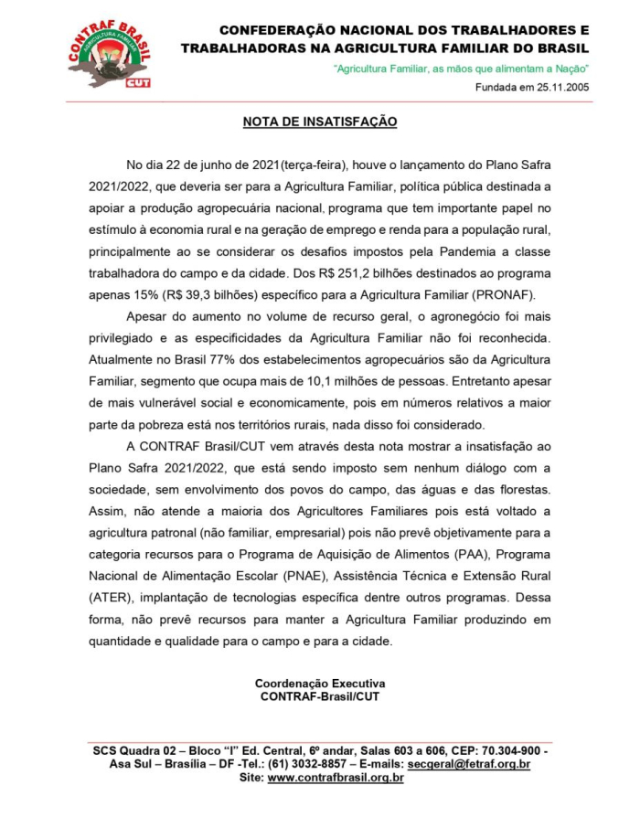 Para a Coordenação Executiva da Contraf-Brasil/CUT o Plano Safra 2021/2022 é insatisfatório e não atende a maioria dos Agricultores Familiares. Este programa que tem importante papel no estímulo à economia rural e na geração de emprego e renda para a população rural, está sendo instaurado sem nenhum diálogo com a sociedade e, principalmente, sem o envolvimento dos povos do campo, das águas e das florestas.